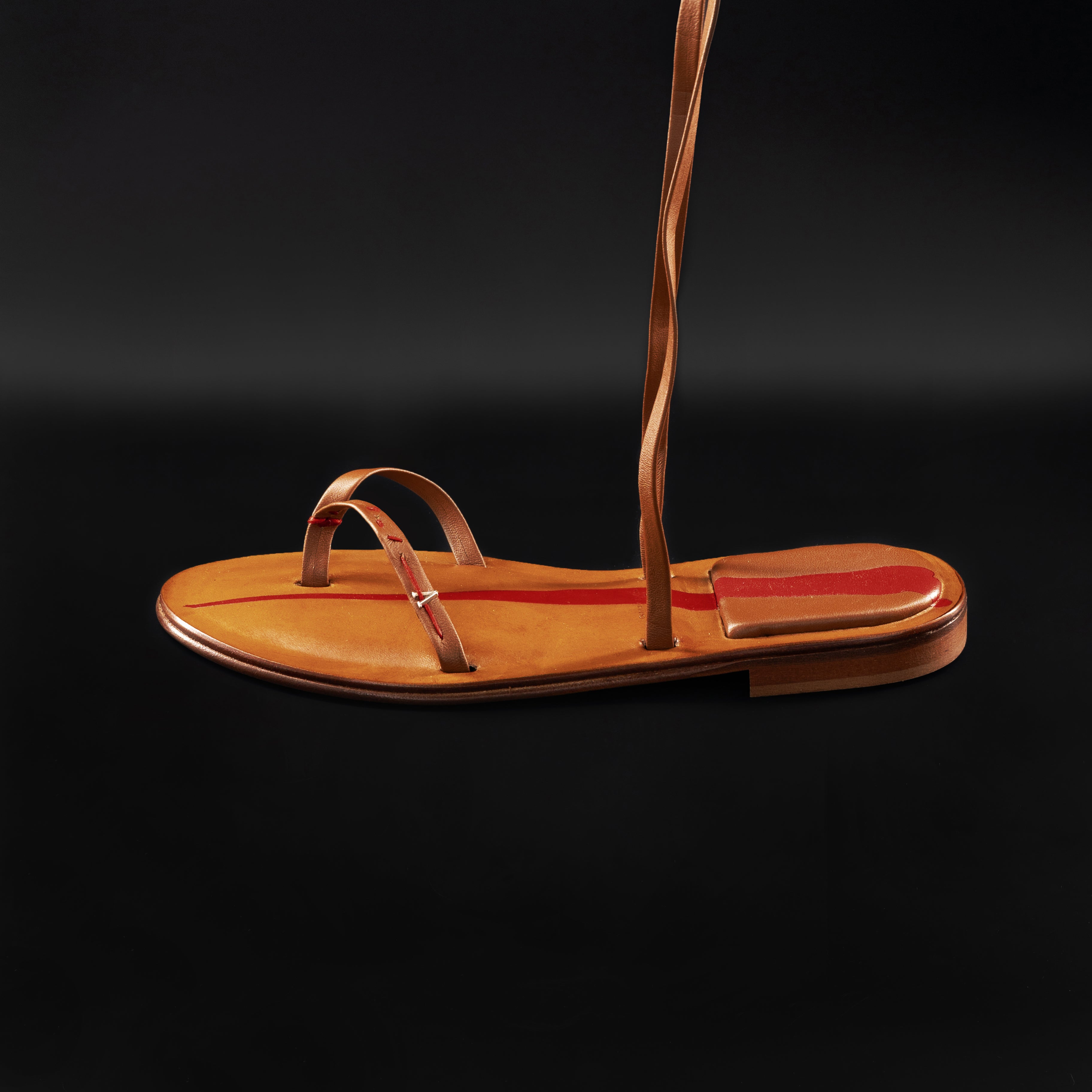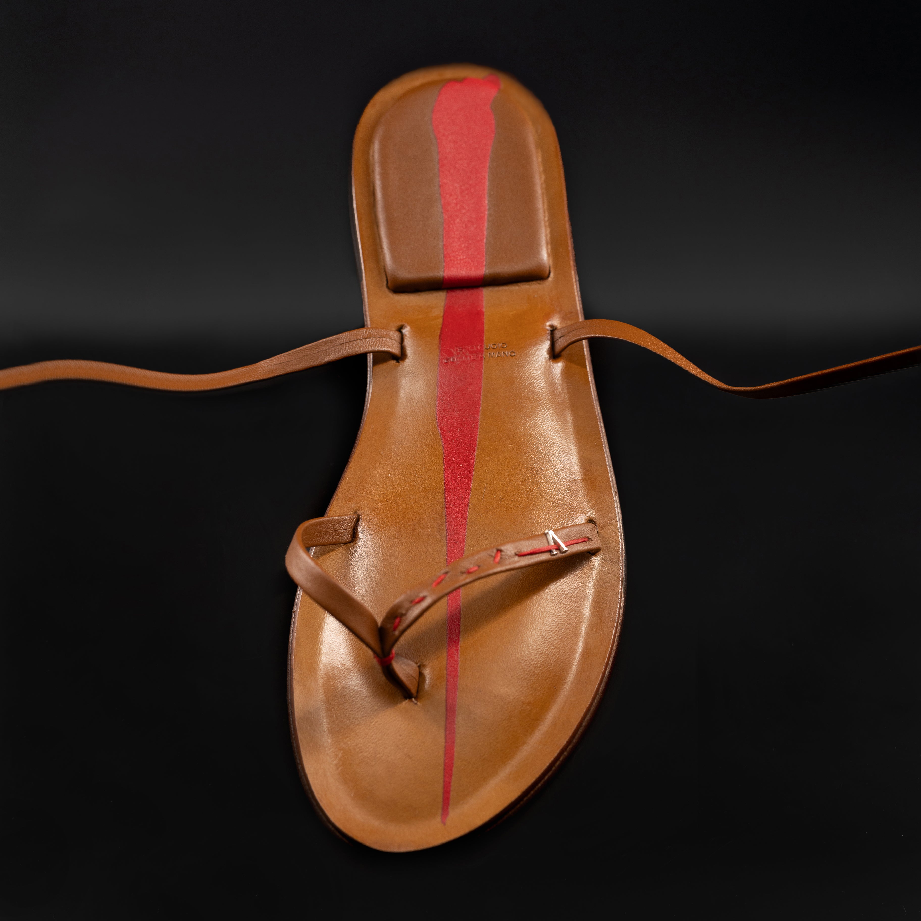 Sandali a infradito alla schiava, con altezza delle fasce in pelle fino alla coscia. Realizzati interamente a mano dai nostri artigiani italiani senza l'uso di macchinari. Ogni cucitura è ricamata solo con ago e filo, proprio come si faceva una volta ed i materiali selezionati sono di primissima scelta.