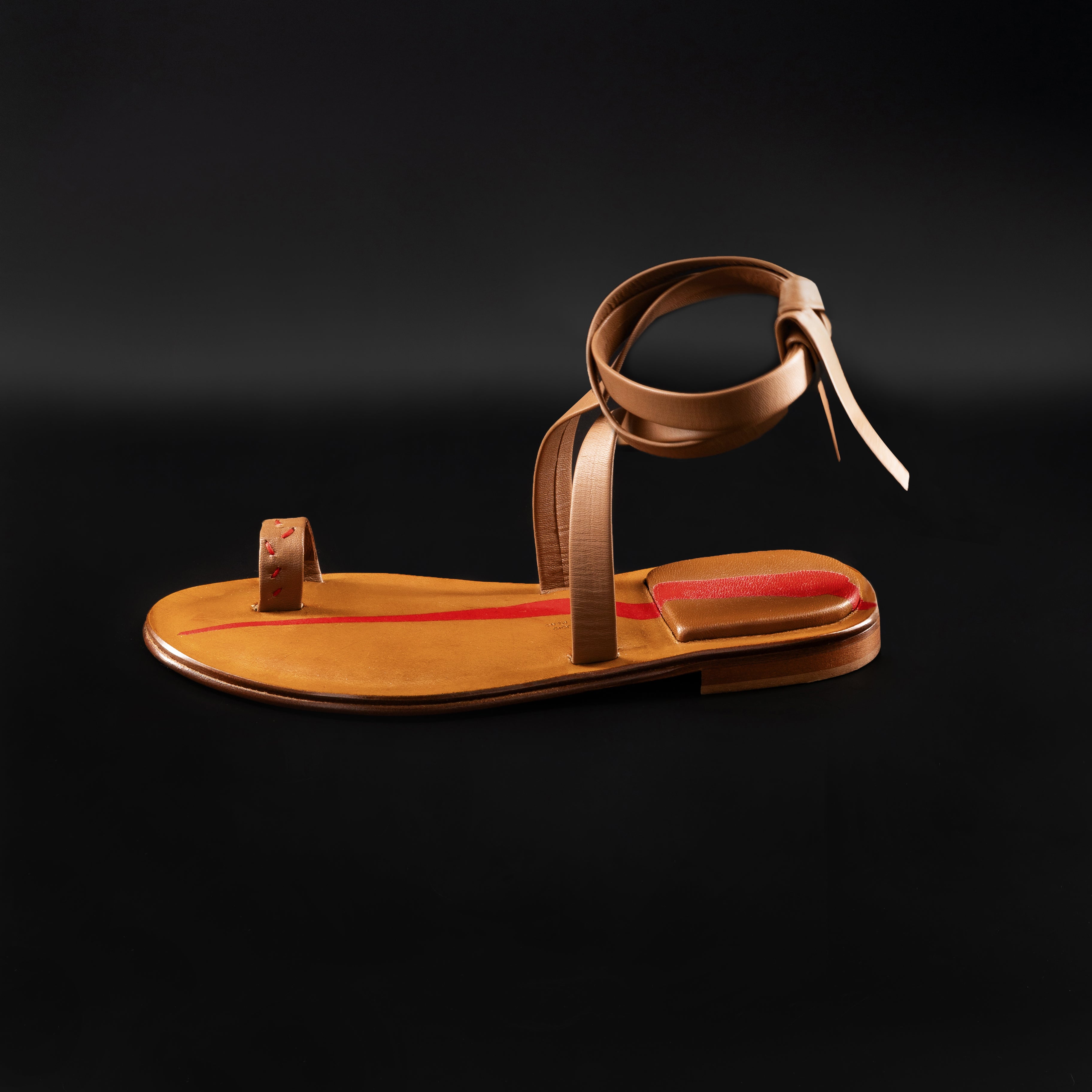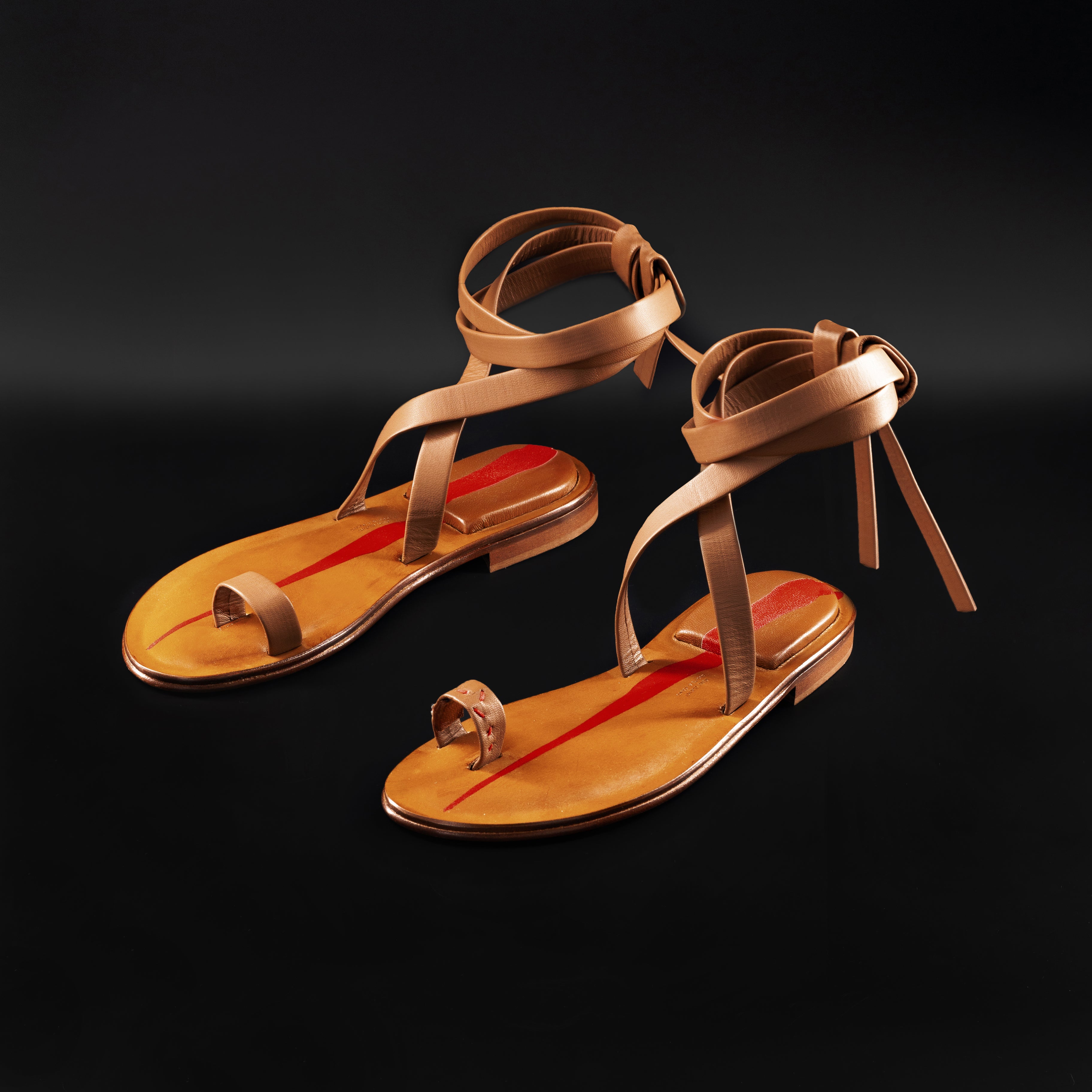 Sandali con fascia in pelle ad anello sull'alluce e lacci in pelle da intrecciare sulla caviglia. Realizzati interamente a mano dai nostri artigiani italiani senza l'uso di macchinari. Ogni cucitura è ricamata solo con ago e filo, proprio come si faceva una volta ed i materiali selezionati sono di primissima scelta.