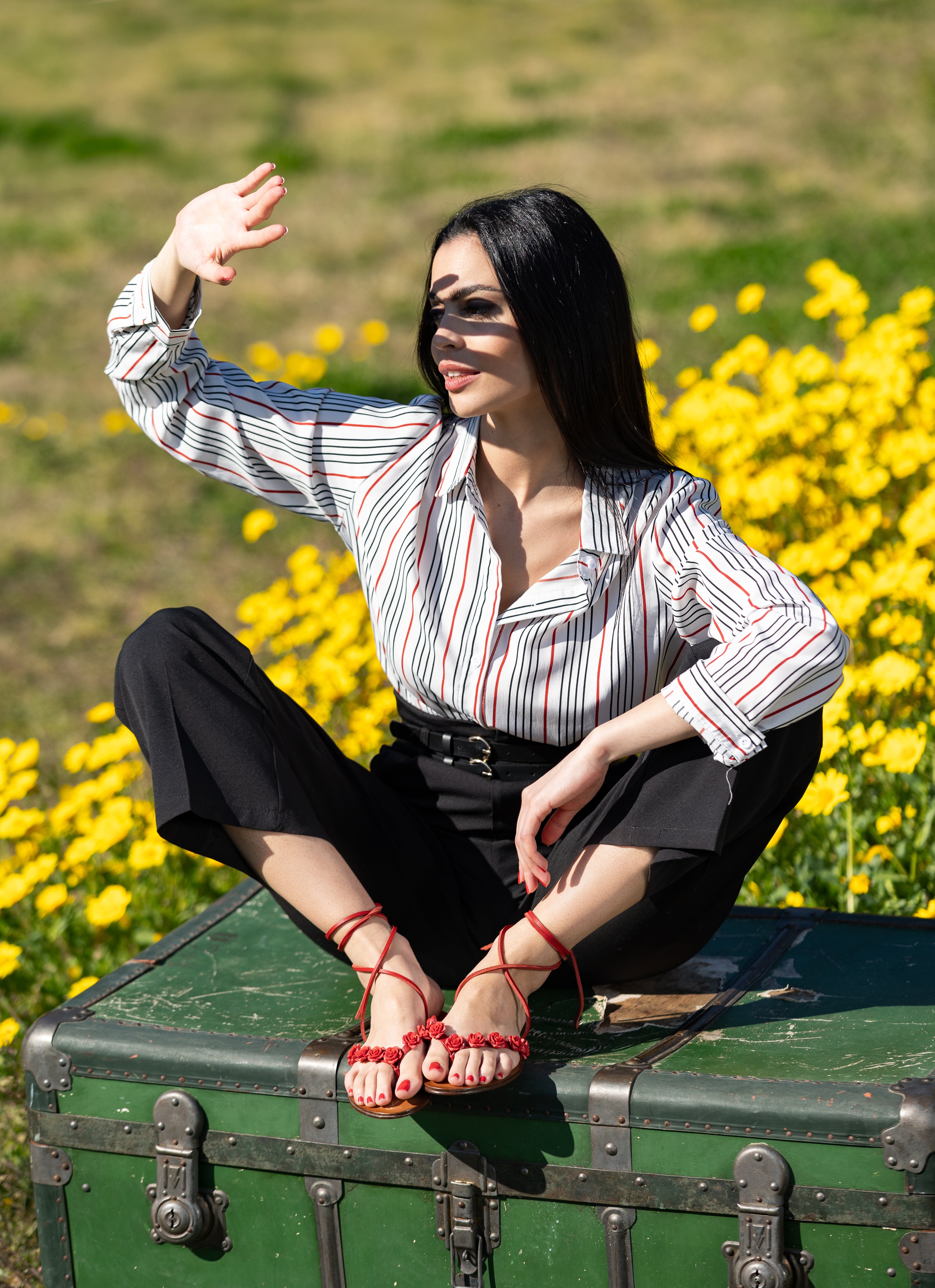 Scopri la raffinatezza e l'eleganza dei nostri sandali ad infradito intrecciati fino alla caviglia con un laccio di cuoio e preziose rose rosse ricamate a mano sulla tomaia. Sulla suola vi è incisa una scritta a mano " per sempre romantica", per lasciarti sognare ad ogni passo.