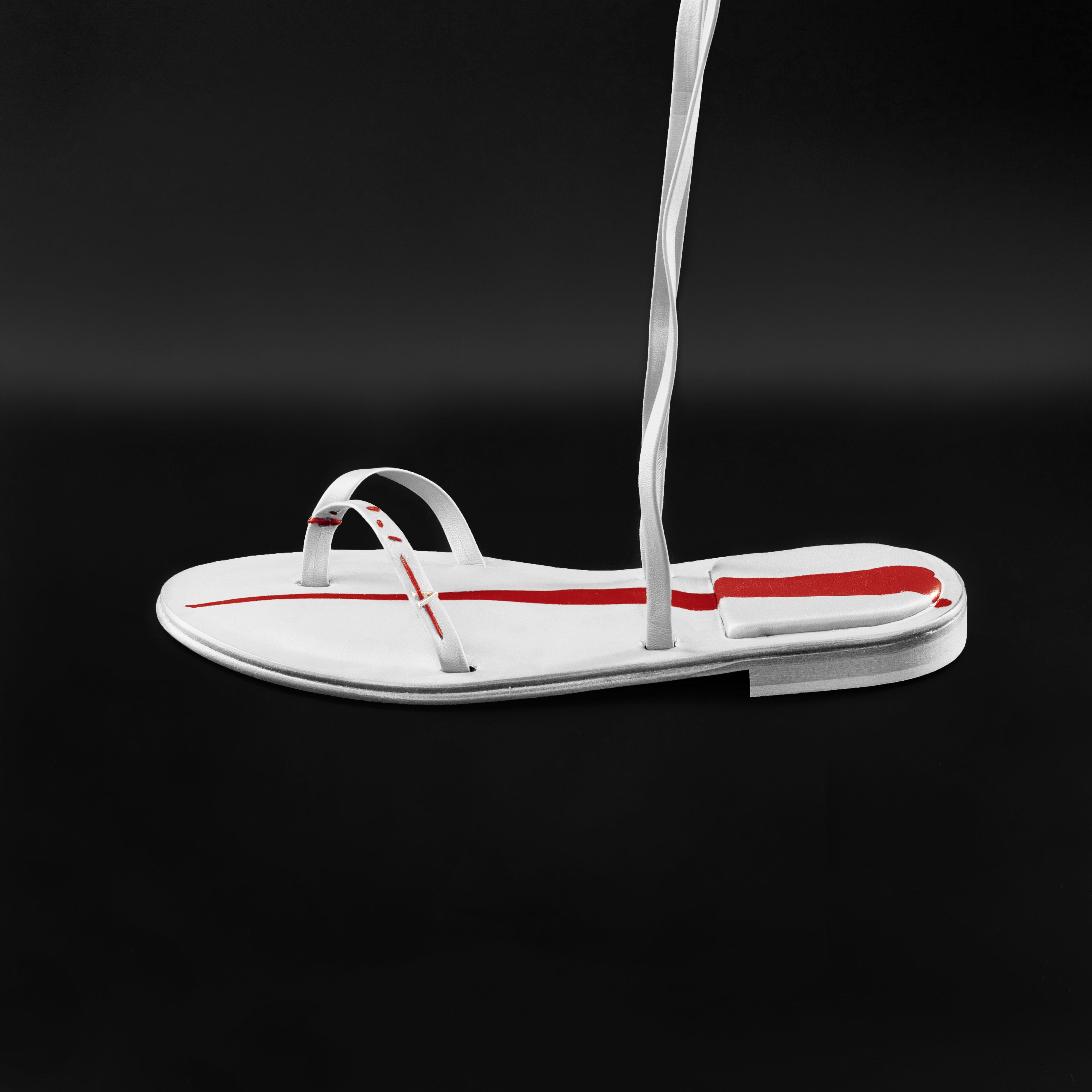 Sandali a infradito alla schiava, con altezza delle fasce in pelle fino alla coscia. Realizzati interamente a mano dai nostri artigiani italiani senza l'uso di macchinari. Ogni cucitura è ricamata solo con ago e filo, proprio come si faceva una volta ed i materiali selezionati sono di primissima scelta.